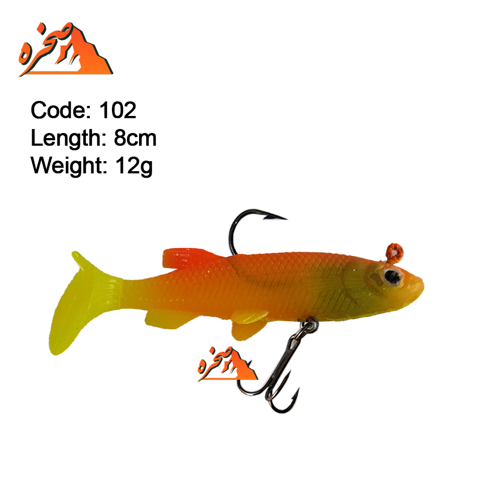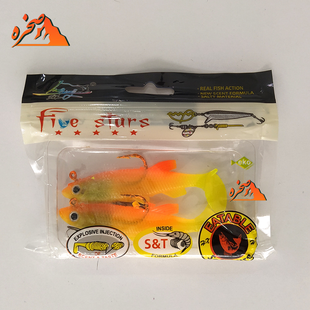 ماهی ژله ای نارنجی برند five stars کد 102 با طول 8 سانتمتر و وزن 12گرم برای شکار ماهیان مهاجم مثل شیربت ، اردک، قزل الا، سونگ و… استفاده می شود، این ماهی ژله ای از برند  FIVE STARS از یک قلاب سه شاخ و یک قلاب تک شاخ فولادی می باشد. طعمه های ژله ای از رایجترین ابزار در صید ماهیهای مهاجم در سبک اسپینینگ میباشد. قدرت مانور بالای در ماهیگیری و جنس نرم طعمه که شبیه به غذای طبیعی ماهی میباشد، فرصت بهتری را برای صیاد فراهم میکند. طعمه های ژله ای برند FIVE STARS نامی شناخته شده است. این ماهی زله ای دارای یک قلاب سه شاخه و یک قلاب تک شاخ فولادی میباشد.