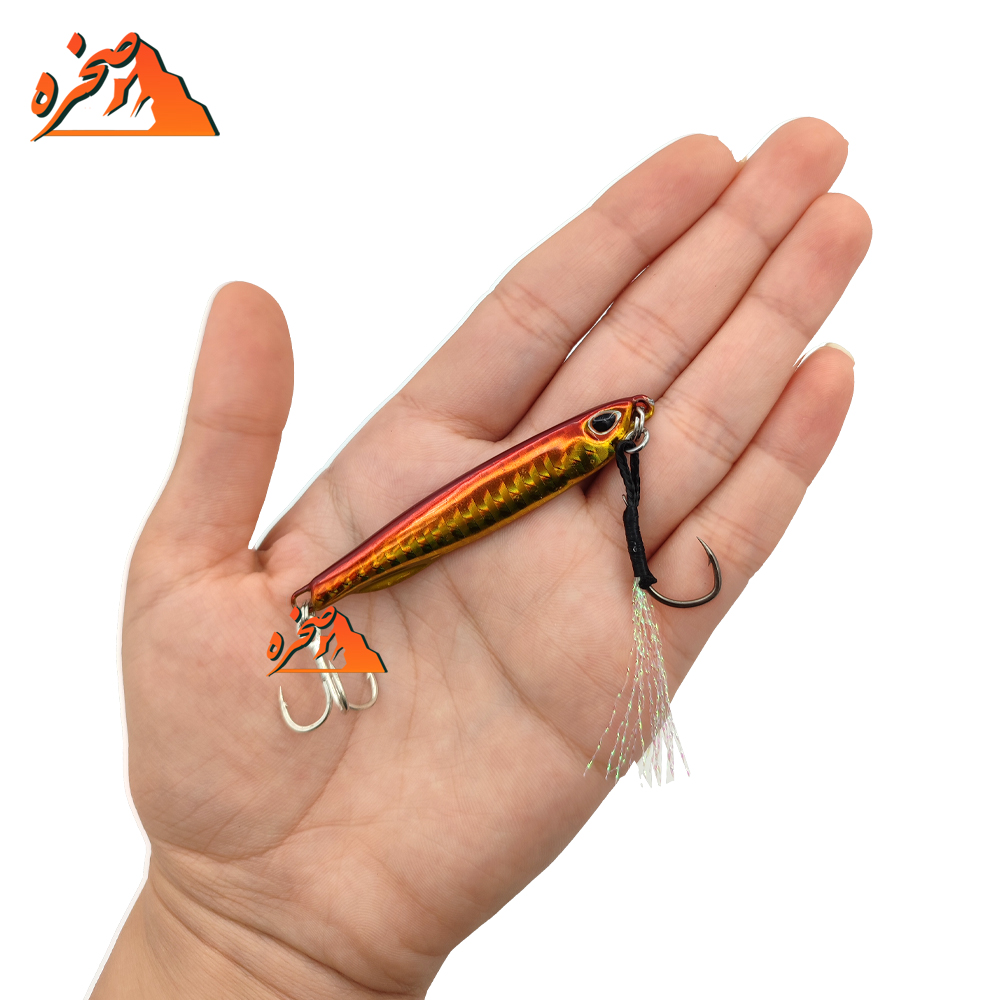 طعمه جیگ ماهیگیری PEROBEROS8 نارنجی طلایی برای صید ماهی های مهاجم آب شور از جمله شیر ، باراکودا ، گیش و … به روش جیگینگ از روی قایق استفاده می گردد، که در این روش طعمه جیگ به عمق آب فرستاده می شود و با حرکت چوب و چرخ طعمه را به سطح آب می آورند انتخاب طعمه جیگ مناسب از نظر نوع ،سایز ،وزن و رنگ ، بستگی به نوع ماهی هدف و مکان ماهیگیری میباشد . جیگ ماهیگیری نوعی طعمه ماهیگیری وزنی است، جیگ شامل یک سینک فلزی سنگین (معمولاً سربی ) که با یک قلاب سه شاخه ویک قلاب تک شاخه به ماهی متصل است.
