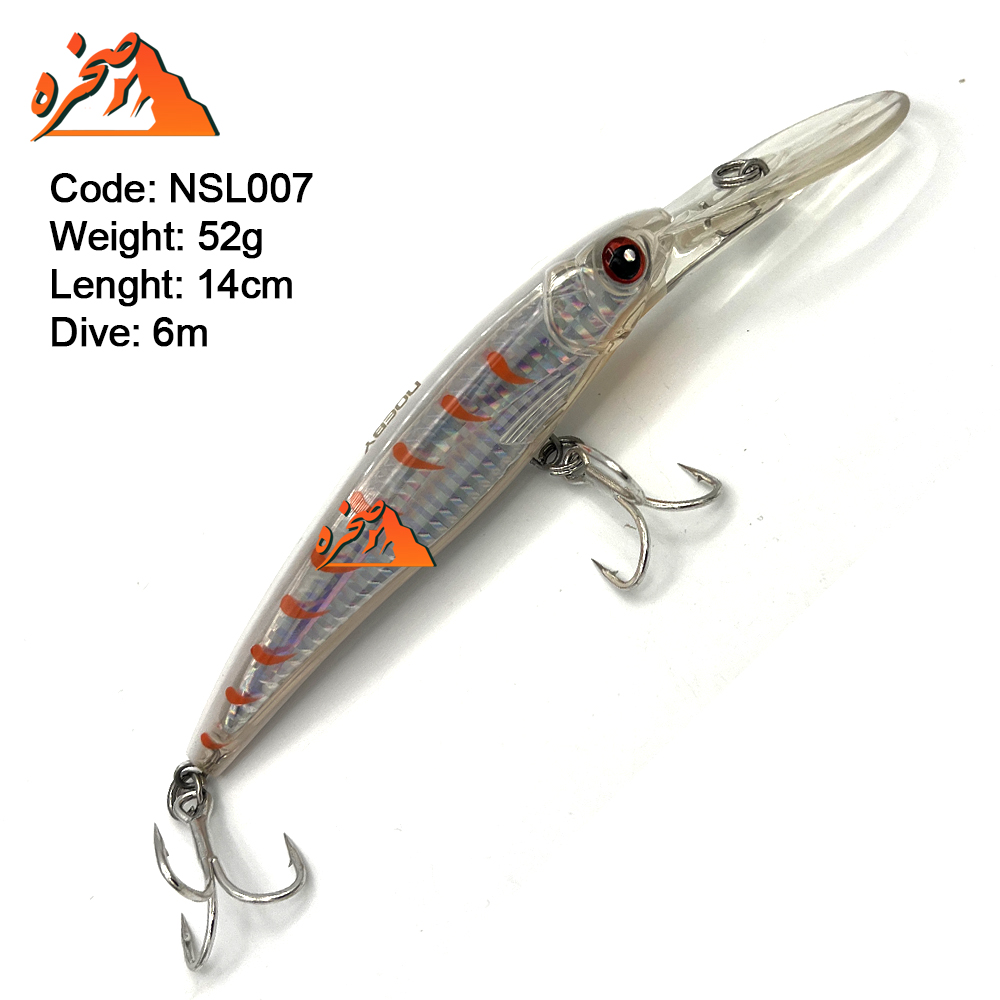 طعمه ترول نئوبی مدل NSL007T دایو 6 متر با وزن 52 گرم و طول 14 سانتی متر، به جرعت میتوان گفت طعمه های NSL یکی از بیشترین تنوع ها در بین طعمه ها ی موجود در بازار میباشد . این طعمه نئوبی از نک تا انتهای آن یک مفتول سیمی ضد زنگ کشیده شده و تمام حلقه ها و قلاب های طعمه را در بر گرفته می شود. لور ترولینگ NOEBY دارای لیپ بزرگ جلوی طعمه باعث میشود طعمه سریع عمق 6 متر بگیرد. بدنه استخوانی محکمی دارد و رنگ داخلی ماندگاری دارد.